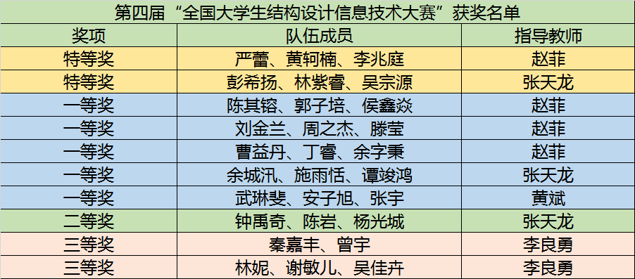 2022年5月10日,第四届“全国大学生结构设计信息技术大赛”获奖名单公布,由YABO鸭脖BIM协会选拔的10支队伍参赛并全部获奖,获奖率为100%!其中荣获特等奖2支队伍,一等奖5支队伍,二等奖1支队伍,三等奖2支队伍。可喜可贺的是,由赵菲老师指导的“YABO鸭脖(严蕾、黄轲楠、李兆庭)”团队以95.25的高分获得全国特等奖第一名!除此之外,赵菲老师和张天龙老师获优秀指导教师奖。