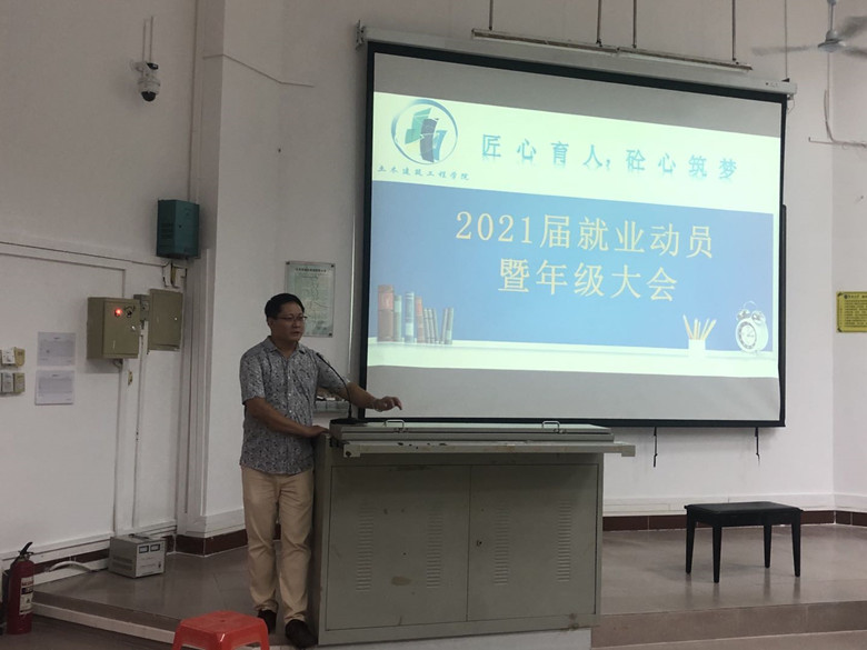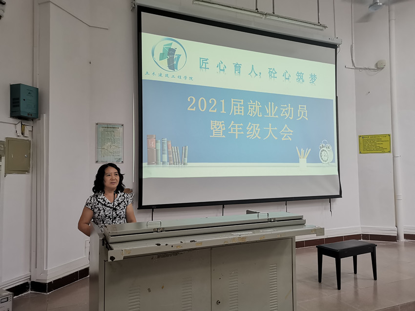 大会上,学院党委孙晓媛副书记对当前高校毕业生的就业和考研形势及当前建筑行业的发展态势和就业前景做了深入浅出的分析,引导学生认识到疫情影响下,考研态势、就业形势的变化,认识到行业发展态势的严峻性,正确定位,正确选向,树立正确的择业观。对此,孙副书记对2017级全体学生提出了三点要求和两点建议,要求同学们一是要树立担当意识,二是要明确就业目标,三是要补齐短板,增强竞争能力;提出了从自身发展的目标去思考选择考研还是就业,从简历、面试、了解企业信息等方面提前做好就业准备工作的两点建议。