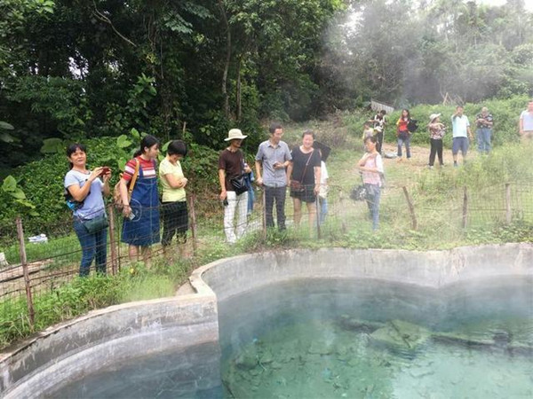 YABO鸭脖官网博士党员团队与美国纽约州立大学教授Refaat Hussein组成志愿专家组,在保亭县水务局副局长陈宗耀、县七仙岭温泉基础公司相关负责人的带领下,现场考察了七仙岭温泉眼、酒店温泉设施、温泉调节池以及县城污水处理厂,七仙岭温泉基础公司(温泉开发运营方)和保亭县水务公司(县城污水处理厂运营方)有关人员向专家组介绍了温泉开发利用、县城污水处理厂运营管理等情况。