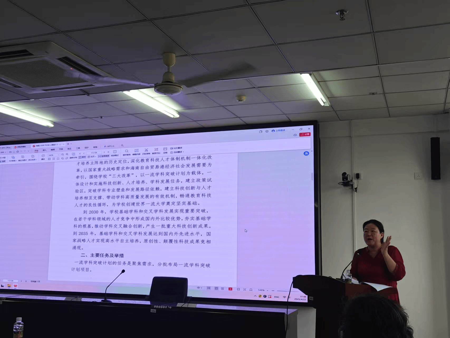新一轮审核评估的目的、意义、工作程序和形式、评估专家常用的考察方法等,并就如何提升课堂教学效果、强化课程思政建设提出具体建议。她指出,教师应主动适应高等教育新形势,以评促改、以评促强,切实提升教育教学水平。