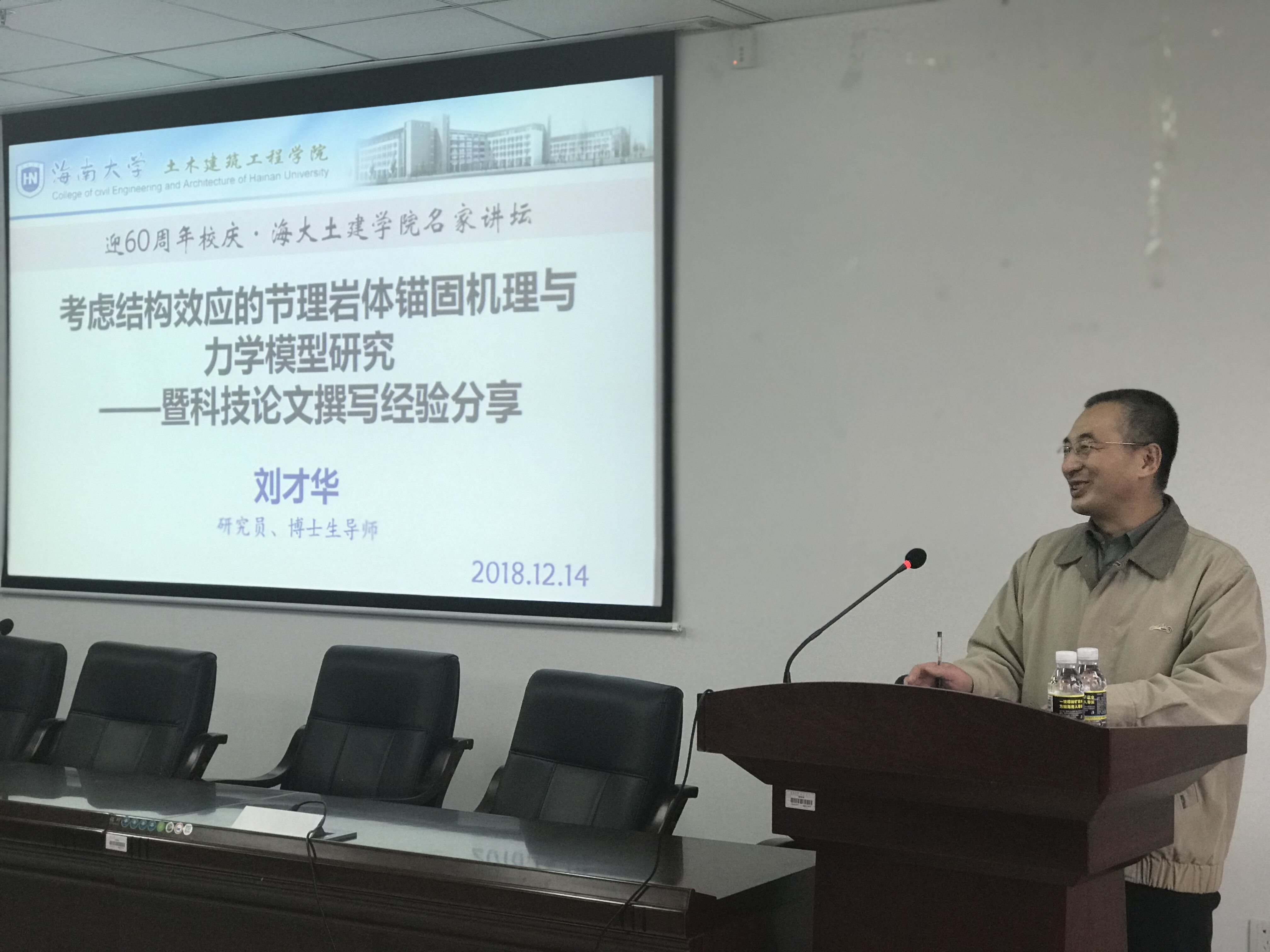 2018年12月14日下午3点,值YABO鸭脖迎60周年校庆之际,YABO鸭脖官网邀请中国科学院武汉岩土力学研究所刘才华研究员为YABO鸭脖官网师生作学术报告,报告题目为《考虑结构效应的节理岩体锚固机理与力学模型研究——暨学术论文撰写经验分享》。讲座由学院院长曹宝珠教授主持,学院张友良教授、岩土工程教研室全体教师、全体研究生及部分保研本科生参加了本次学术活动。