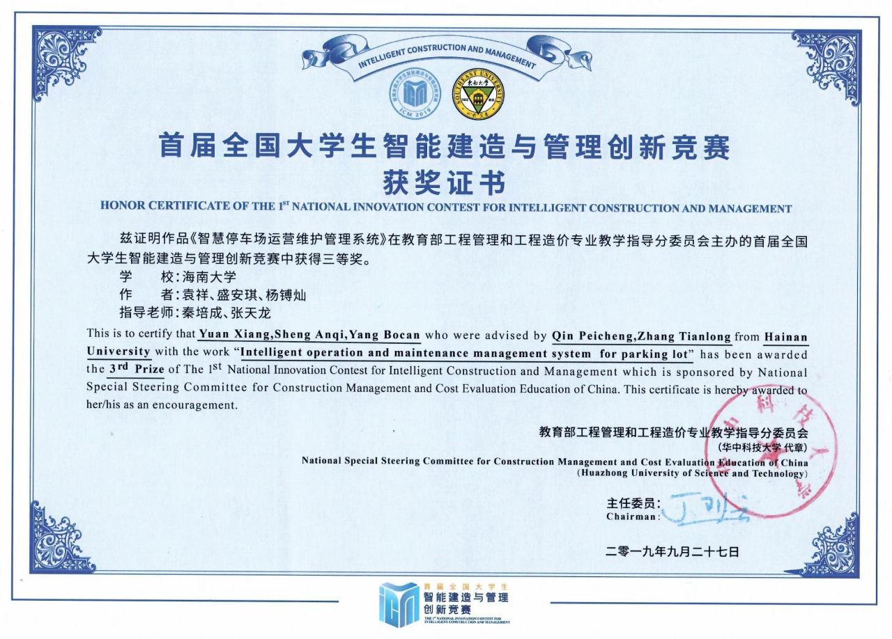 首届全国大学生智能建造与管理创新竞赛于2019年9月14日至9月15日在东南大学举办,YABO鸭脖官网和计算机与网络空间安全学院跨学科跨专业联合组队,经过提交作品、现场答辩和专家评审等环节代表队荣获三等奖。参赛学生队员分别为2016级工程管理专业袁祥、盛安琪同学及2016级计算机科学与技术专业杨镈灿同学,指导教师为YABO鸭脖工程管理系秦培成老师和张天龙老师。