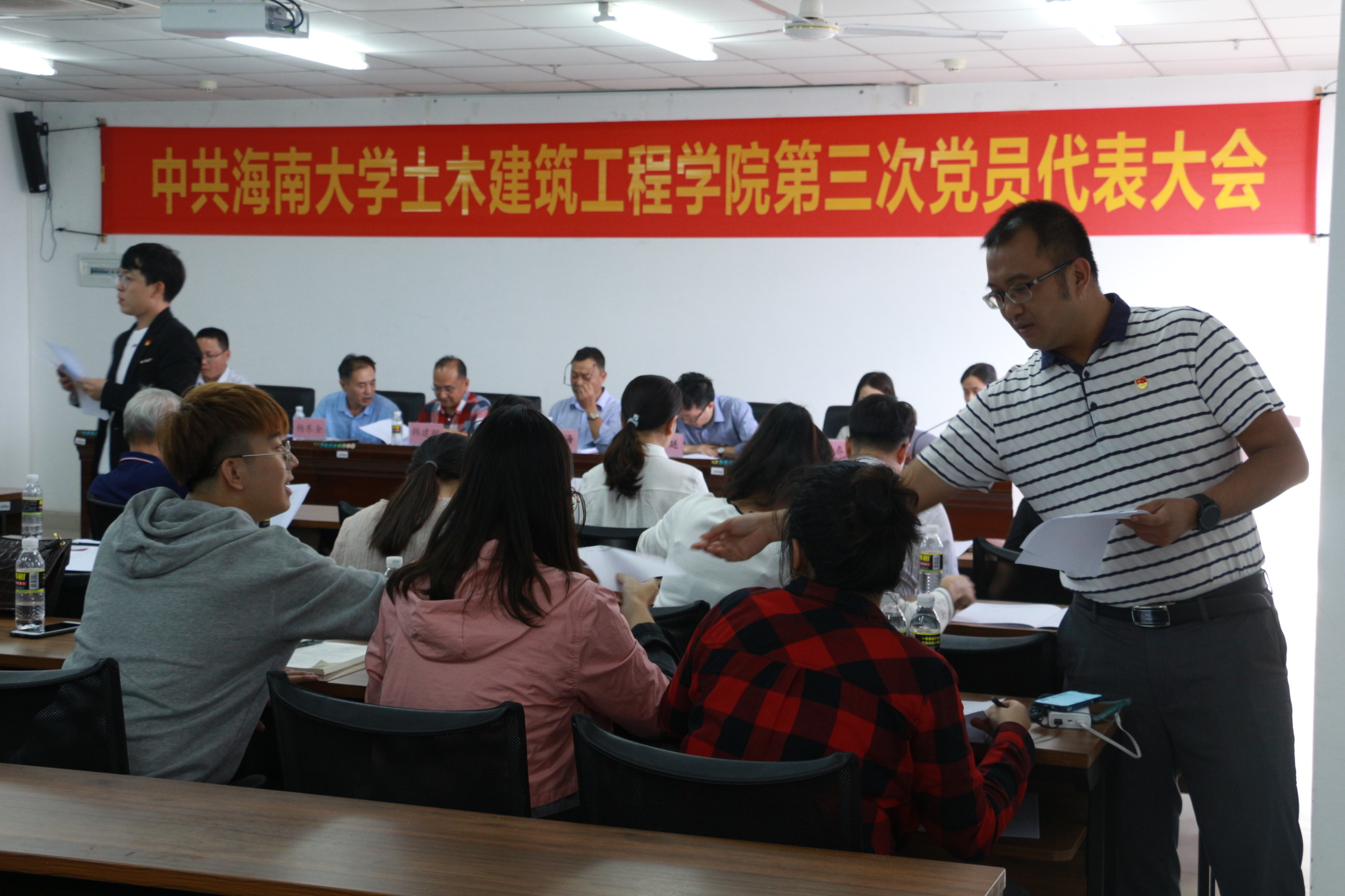 在悠扬的国歌声中,大会拉开帷幕。随后,学院党委书记以“以习近平新时代中国特色社会主义思想为指引立德树人,为创建一流土木学科而努力奋斗”为主题发表了会议报告。报告中,卢书记从办学规模和质量,办学基础条件、学科专业建设、科研创新、党建工作等多个方面详细综合地描述了YABO鸭脖官网近四年来的发展与突破,并对全院师生员工表示衷心的感谢,并对学院工作中的不足提出改进要求及希望。随后,就当前学院面临的重大发展机遇和严峻挑战,卢书记提出“促进海南和南海经济社会发展为人才培养和学科建设的目标”,以传统土木工程相关学科为基础,向海洋土木工程领域发展,打造具有热带、岛屿和海洋特色鲜明的一流学科。在未来4-5年内实现将YABO鸭脖建设成为以土木工程和海洋工程学科为主、建筑学和工程管理等多学科协调发展,具有“海洋”特色的,在国内具有一定影响的教学研究型学院的总体目标,并对学科建设和办学规模、师资队伍建设、人才培养、教学科研成果、教学科研基础条件五大方面提出了具体要求。