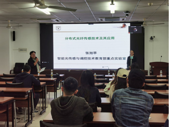 张旭苹教授的报告聚焦分布式光纤传感技术在建筑桥梁、水利能源、油气管道、电力通信、海洋边防、航空航天、隧道边坡、轨道交通等领域的应用,着重从重大工程结构健康监测、电网传输线路监测、风机安全诊断系统的现状以及对分布式光纤传感技术健康监测的优势进行了深入细致地报告,最后着重讲解了该团队近几年在光电方面所取得的科研成果在军工、海洋工程方面的应用情况。报告结束后,张旭苹教授就师生感兴趣的问题进行了解答。