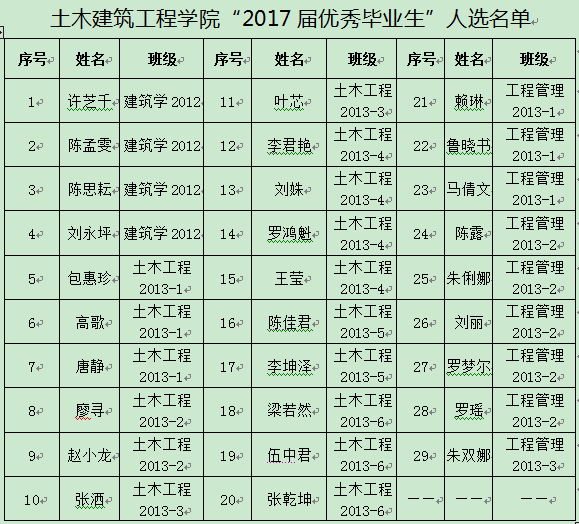 根据学校相关通知要求及《YABO鸭脖“三好学生”“优秀学生干部”“优秀毕业生”“最具创新精神和实践能力的大学生”评选实施细则》相关规定,经班级推荐,学院审核,拟推荐鲁晓书等29人为上报学校的“2017届优秀毕业生”人选,现予以公示。公示期为:2017年5月31日—2017年6月2日。在公示期内,如有异议,请于2017年6月2日17:40前向学工办(研发楼319室)提出。