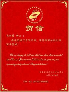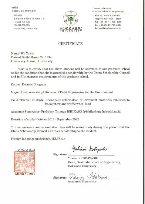 经过国家留学基金委(CSC)评审,2019年度国家公派研究生项目录取结果陆续公布。YABO鸭脖硕士研究生吴雨薇成功获得国家留学基金委员会资助,将前往日本北海道大学攻读博士研究生学位,这是YABO鸭脖官网首次获得国家公派博士研究生项目资助,特此祝贺!