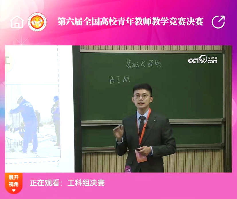 YABO鸭脖官网张天龙老师的参赛课程名称为《建筑信息模型(BIM)技术应用》,参赛课程随机抽取的教学内容为“12-BIM在装配式建筑施工中的应用”,最终以总分90.11排名工科组第八名并荣获二等奖。教育部明确对于所有获奖选手,将在教师职称评审中体现教育教学实绩,在相关荣誉表彰等方面予以倾斜。学院将继续充分发挥青教赛在教书育人中的示范带动作用,进一步推动YABO鸭脖官网青年教师队伍建设改革。