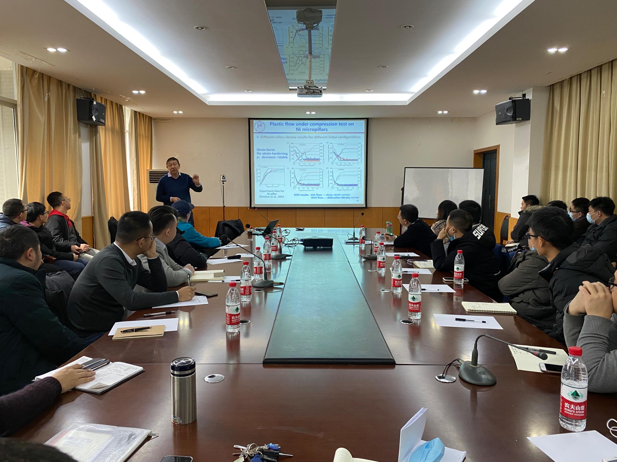 12月4日上午9:00-12:00,庄茁教授在力学楼二楼会议室做了题为“基于位错机制的晶体塑性流动应力—微米及亚微米尺度”的学术报告。胡衡教授、徐远杰教授、陈明祥教授、楚锡华教授、刘泽教授及学院众多青年教师、研究生到场参会。庄茁教授围绕晶体材料塑性力学行为这一前沿科学问题,详细地介绍了其团队首创和发展的基于离散位错机制的晶体塑性模型理论和计算方法,及其在单臂位错源控制的塑性流动和带涂层晶体材料塑性力学行为中的应用。研究成果在相关领域达到了国际领先水平,受到国内外同行的关注和报道。报告结束后,参会师生踊跃提问,现场学术氛围热烈,与会师生进行了热烈的探讨和交流。