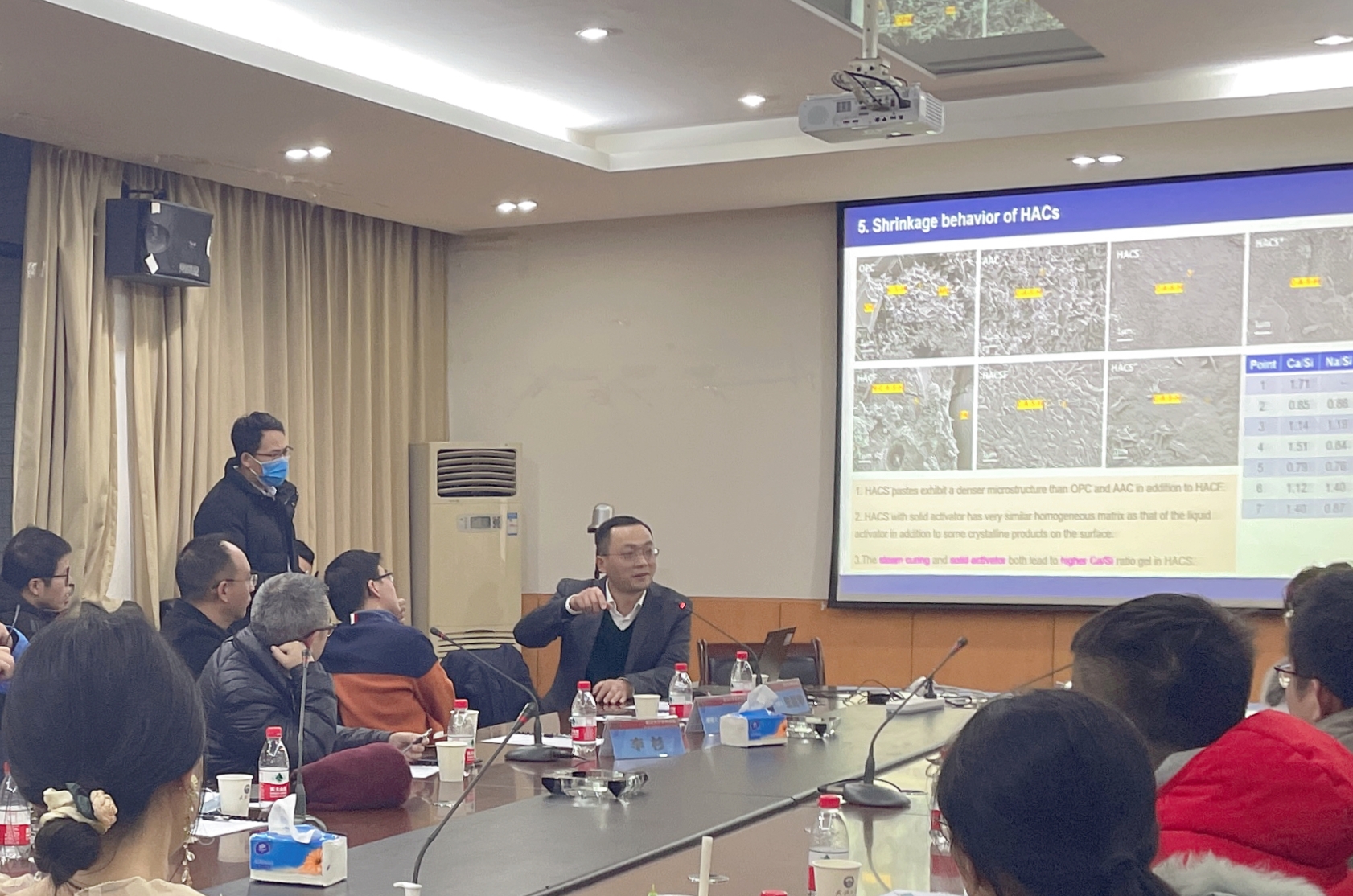 讲座当天气温骤降,仍有许多来自不同院系的教职工和研究生前来参加,会议室内座无虚席。张教授从7个方面具体介绍了他所带领的课题组在碱激发复合水泥方向的研究内容与成果,包括碱激发复合水泥的水化过程的微观结构和控制、收缩行为、强度发展以及碳排放等多个学术问题。张教授讲述时条理清晰、语言风趣轻快,观点结论鞭辟入里、深入浅出,在场的同学收获满满。
