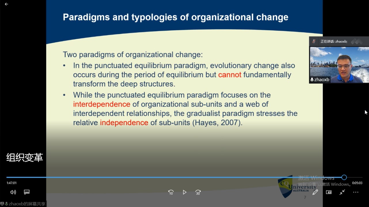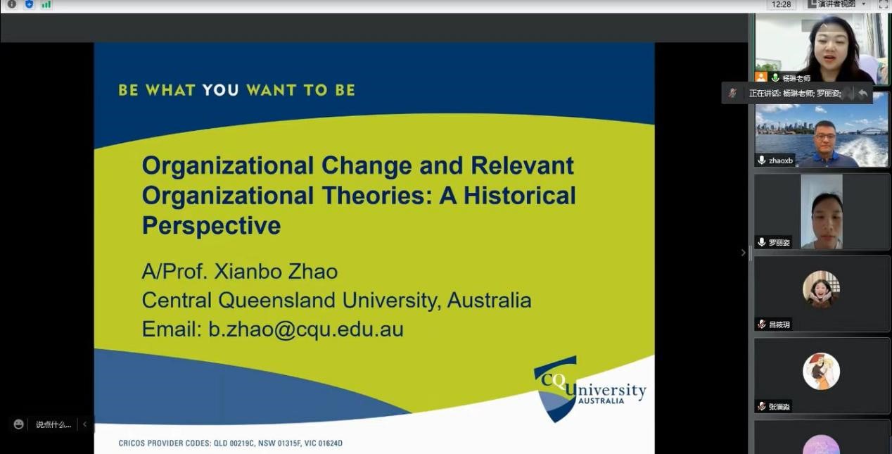 2022年5月24日19:00,应Bsports官网工程管理系杨琳副教授邀请,来自澳洲中央昆士兰大学建筑环境与管理学院的赵宪博副教授作了题为“Organizational change and relevant theories: historical perspective”的线上讲座。罗丽姿老师及三十余名研究生参会。赵教授的科研成果获专业界广泛认可,曾获2017-2019年中央昆士兰大学出版物认可奖、2021年中央昆士兰大学校长杰出研究奖,入围斯坦福大学2020年和2021年编制的建筑与施工领域世界前2%的科学家榜单。2021年,赵教授被《澳大利亚人报》发布的年度研究杂志评选为澳大利亚建筑领域的顶尖研究员。