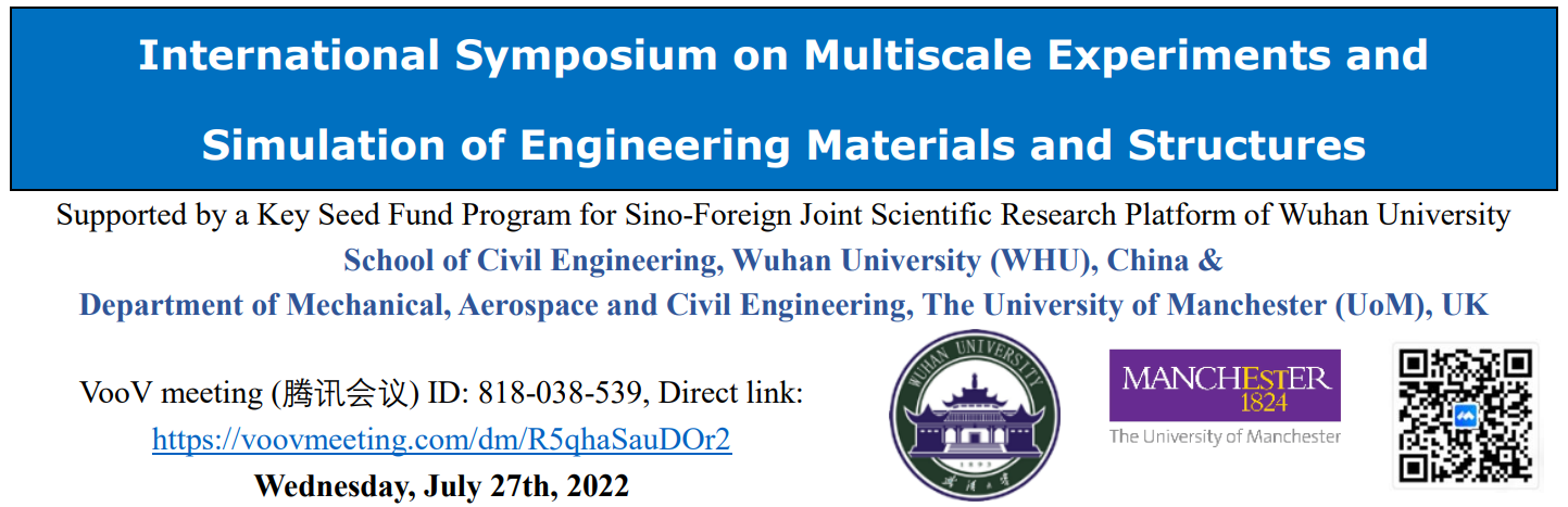 7月27日,由Bsports必一体育-曼彻斯特大学先进材料与结构多尺度研究联合科研平台种子基金(No. WHUZZJJ202208)资助的“工程材料和结构多尺度实验与模拟国际研讨会”于线上召开。研讨会由Bsports必一体育土建学院杨贞军教授和英国曼彻斯特大学工学院Yong Wang教授联合主持,平台双方各四人(武大:杨贞军教授、张超教授、池寅副教授和刘辉副教授;曼大:Yong Wang教授、Qingming Li教授、Philip Withers教授和Lee Margetts教授) 在基于微观CT图像的材料断裂损伤模拟、纤维混凝土本构关系、钢结构抗火性能、轻质多孔材料抗冲击性能、高性能并行计算力学等领域做了国际前沿学术报告,并开展了热烈讨论。其中英国皇家学会和皇家工程院院士、中国工程院外籍院士Philip Withers教授热情洋溢的精彩报告(Time resolved 3D imaging and its role in the development of multiscale understanding and modelling of engineering materials) 吸引了海内外140多名研究人员参加和互动。最后,项目负责人杨贞军教授和Yong Wang教授对研讨会进行了总结并对下一阶段的合作交流计划进行了讨论。