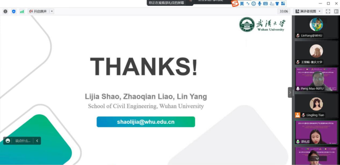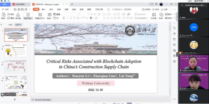 邵礼佳同学全英文汇报了研究成果“China's International Engineering Risks in the Post-epidemic Era based on the Network Theory”。该研究识别了疫情时代中国国际承包商的风险,并通过复杂网络理论确定关键的风险及其传递机理,为承包商提出相应的建议。