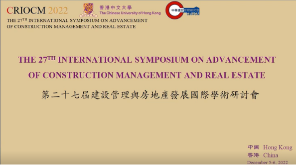 2022年12月5日至12月6日,中华建设管理学会(CRIOCM)和香港中文大学共同主办的第27届建设管理与房地产发展国际学术研讨会以线上会议的形式举行。CRIOCM 2022是建设管理与房地产领域具有重要影响的国际性学术会议之一。本次会议主题为“后疫情时代的建设管理和房地产:为健康生活建设智慧和韧性城市”。