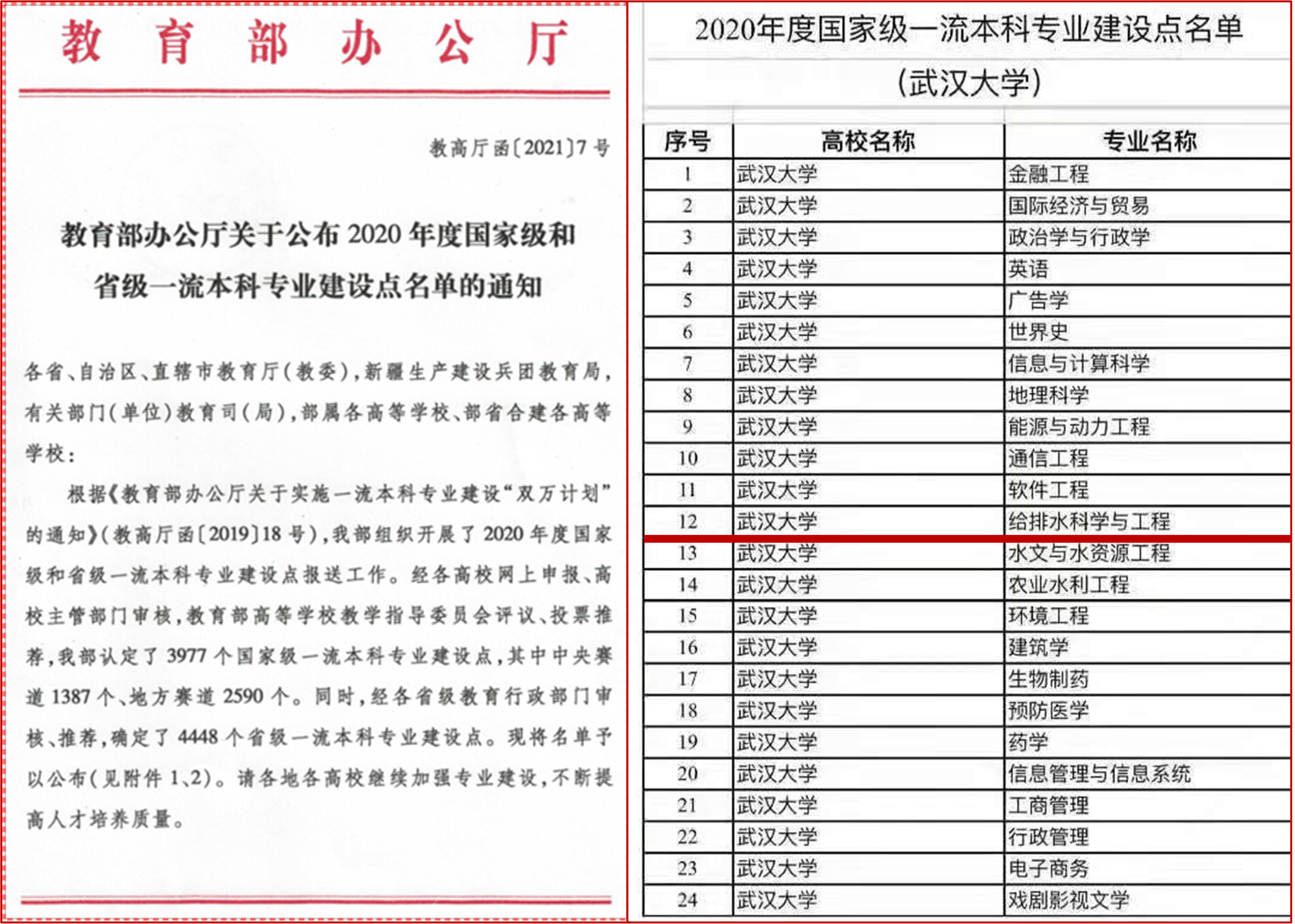近日,教育部公布了2020年度国家级和省级一流本科专业建设点名单,Bsports官网给排水科学与工程专业获批国家级一流本科专业建设点。这次一起获批的给排水科学与工程一流专业的高校还有清华大学、湖南大学等。近年来,给排水科学与工程专业持续优化专业培养方案,改善实验室条件,提升教学质量,此次入选是对Bsports官网排水科学与工程专业办学水平的肯定。