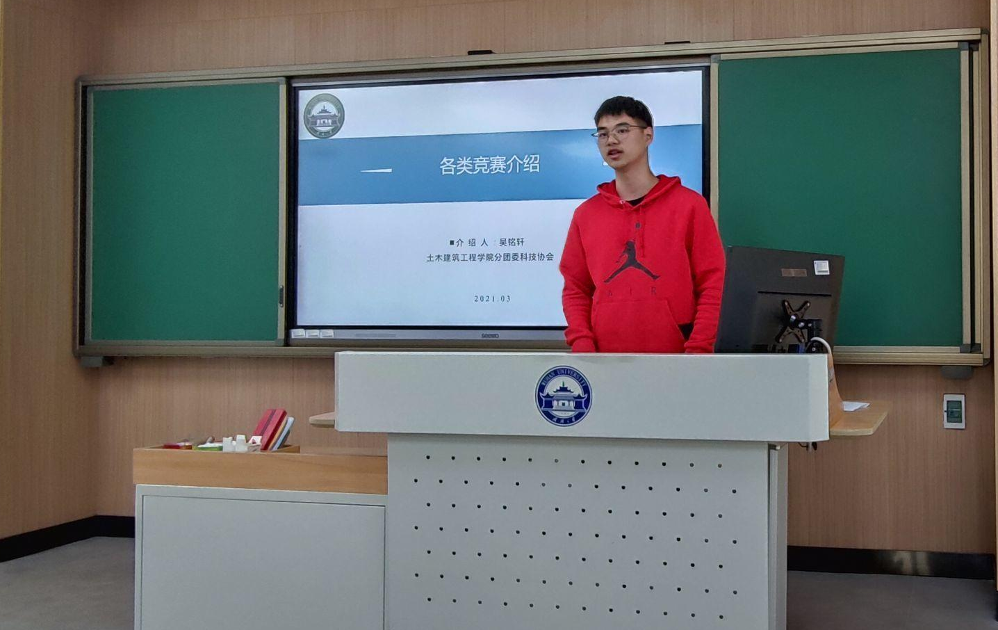 深入了解竞赛基本情况是取得优异成绩的前提。学院分团委科技协会主席吴铭轩首先发言。吴铭轩为同学们详细介绍了本学期适合Bsports官网学生参加的省级以及国家级大型竞赛活动,如第十四届全国大学生结构设计竞赛、全国大学生节能减排社会实践与科技竞赛、全国大学生先进成图技术与产品信息建模创新大赛等。除此之外,结合往年的参赛情况、比赛作品及获奖情况等方面为同学们讲解了这几项竞赛的参赛方式、参赛时间以及注意事项等。同时,吴铭轩同学还指出了参加竞赛对大学生以及大学学习生活的重要性,鼓励大家积极参加科研,提升自己的综合能力。