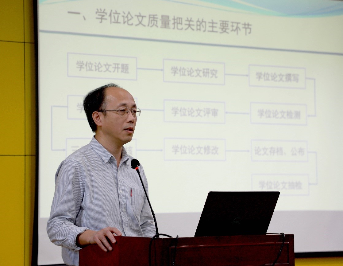研究生院副院长王建波作了题为《加强过程管理,提高学位授予质量》的报告。王院长以问题为导向,从当前学位论文存在的主要问题出发,分析研究生学位授予工作存在的不足,并提出了针对性的解决方法。他强调,要做到严格全过程培养,就要进一步明确导师职责,要重视学位论文写作、重视学术诚信、严格答辩资格审核、严格论文查重与评阅、严格论文答辩过程、重视学位授予过程、重视论文修改和审核等每一个环节。使导师进一步明确了提升培养研究生质量的方向。