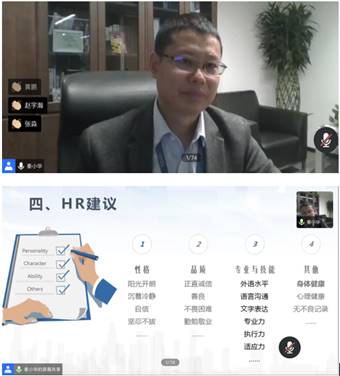张作启教授为同学们简要介绍了各位嘉宾,他们都是99级011力学班同住在1309室的学长,目前分别在高校、国企、地产等不同领域有着良好的发展。毕业17年后以这种特殊的方式云端相聚,他们深厚的情谊让同学们深受感动。讲座开始后,由中国电建集团国际工程有限公司人力资源部总经理秦小华学长作为主讲嘉宾,从人力资源的视角出发对职业、行业和专业进行了深入解读。秦总为19级新生展示了基建行业作为“大国重器”的发展前景以及对人才的需求情况,在此基础上细致讲解了工程力学专业学生以后可能从事的工作岗位,帮助大家明晰未来的发展方向。他结合亲身体会谈到:“在工程力学专业同学们不仅能学到宽厚的力学基础知识,更重要的是培养较强的逻辑思维能力、学习能力和适应能力,这对同学们的未来发展大有帮助。”他也对学弟学妹们的大学生活提出了宝贵建议,鼓励大家在夯实专业基础的同时,多听讲座,广泛阅读,充分用好大学资源拓宽自己知识的广度。
