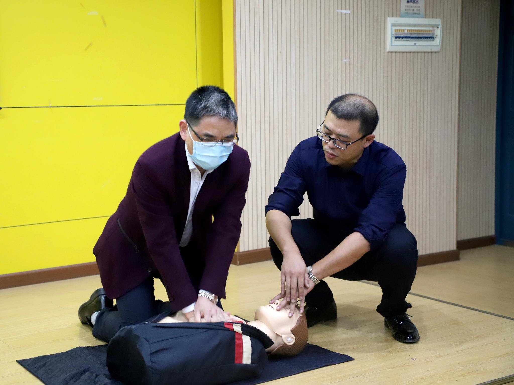 消防安全培训环节,顺防安防火中心的周翔老师为大家介绍了日常生活中存在的安全隐患、排除隐患的注意事项、初期火灾的灭火技巧等。随后,周翔老师为大家做了紧急救护心肺复苏的现场演示,现场师生在周翔老师的指导下纷纷上台演练,掌握“黄金4分钟”的救护技巧。
