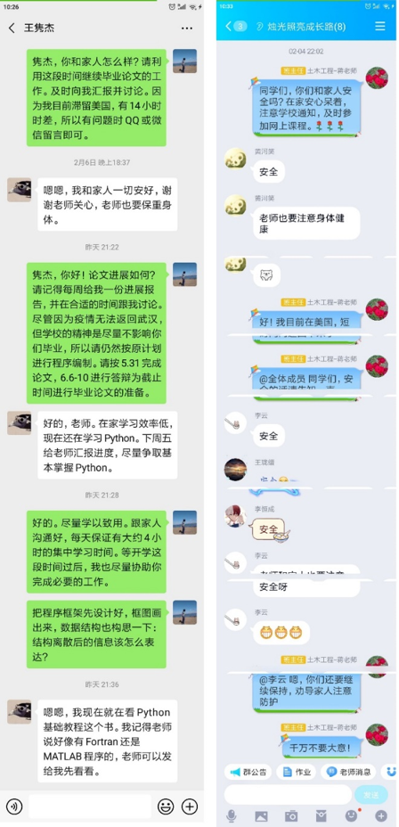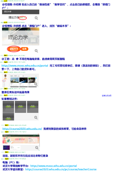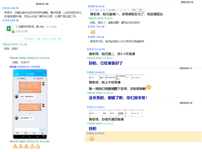 在这非常时期,如同千万武汉人民一样,我仅仅是希望尽自己的绵薄之力,把本职工作做好。我深深知道,在武汉,在湖北,在神州大地上,千千万万的医务人员、物流、政府公务员、志愿者也都在默默努力、勇敢逆行——他/她们才是这个时代真正的英雄!我也知道,为了顺利实现“停课不停学”的目标,学校、本科生院、学院的领导和负责教学的同事们都在加班加点,夜以继日地工作,只为引导老师们适应新的情况,只为保障孩子们能够顺利完成学业。胡俊峰老师1月30日就开始提醒我准备网络授课事宜,开学之后陈海梅老师更是每日一提醒,群里的老师们更是为了实现网络授课热烈地讨论,让我也有身处一线地感觉。