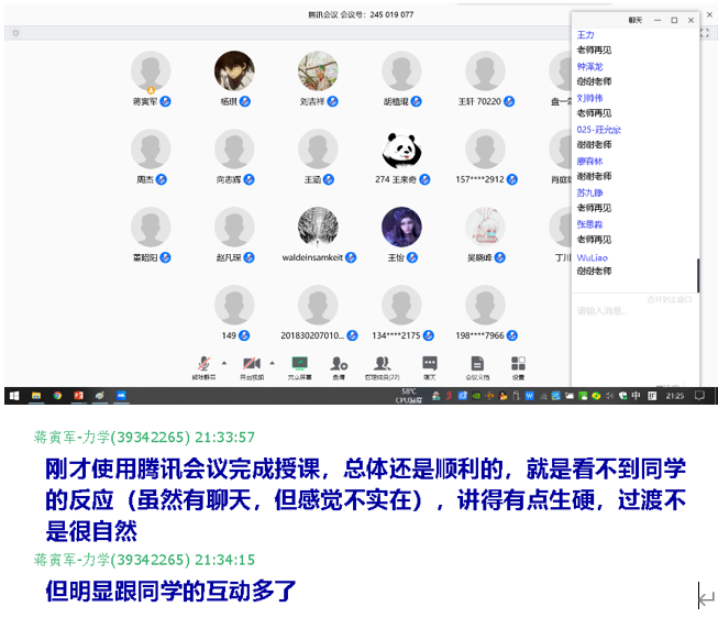“腾讯会议”平台作为直播授课平台是比较流畅的,屏幕共享对于PPT播放也支持很好,免费版300人的会议容量也足够课堂使用,但由于没有回放,讲完过后学生无法回顾老师的授课,所以我计划在第二周试用其他能够支持回放或录像的几个平台,如腾讯课堂、虎牙直播、斗鱼直播、钉钉直播、哔哩哔哩直播等,但目前测试的结果是:除了腾讯课堂及其他教育平台外,虎牙和斗鱼属于娱乐平台,无法实现与同学之间较好的交流;钉钉直播需要先与学生加为好友进入群组才能授课,对班级的维护比较繁琐;学生们推荐的哔哩哔哩直播通过主播认证后一直处于“系统升级维护”状态。另外也必须考虑不能增加学生的负担,如果使用的平台太过小众,对受困在家的同学们的设备和网络也是考验。