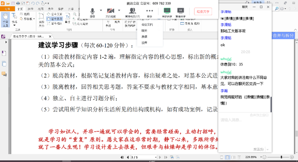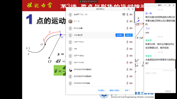 在授课平台的选择上,本来一开始我希望能够使用熟悉的“学习通”平台,但随着开课日近,网络拥堵崩溃时常发生,在试用了几个平台之后,我最终选择了“腾讯会议”系统作为授课平台,利用屏幕共享和聊天实现与同学们的交流。因为理论力学课程的特性,如果我仅仅布置学习任务由大家自学然后由我答疑的方法授课,我担心同学们因为缺乏跟老师的沟通而不能专注,所以我还是选择以直播的方式跟同学们相处2节课的时光。