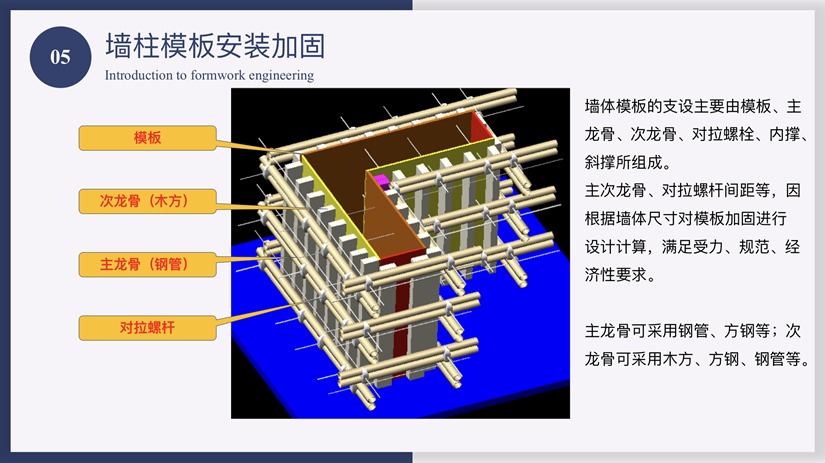 在讲解相对传统的木模体系的讲解过程中,焦鹏工程师强调对主墙模板配模过程中应严格遵循:长边包短边,模板尽量采用横配,尺寸必须准确。以保证模板充分迎合边墙(柱)的垂直度等特性,保证模板体系结构的成型质量。
