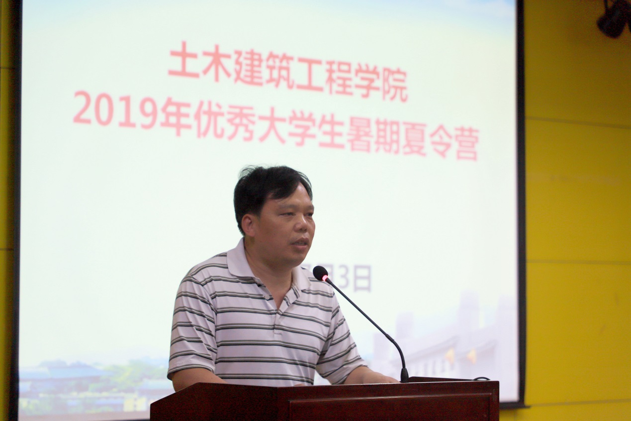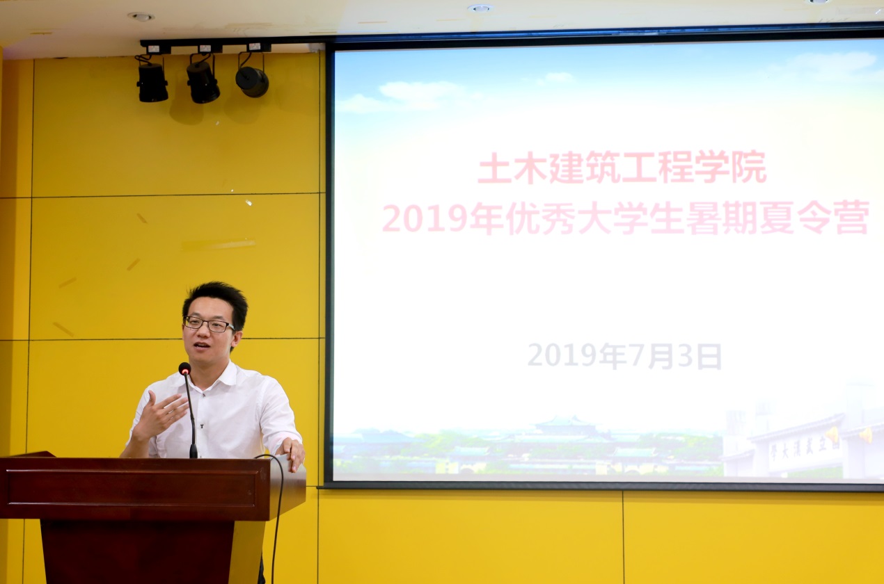 岩土与道桥工程系博导郑烨炜教授,作为本次开营仪式的教师代表为同学们分享了自己的科研经历。在读博期间,郑老师参与了各种大型试验,他认为在科研过程中要能吃苦、肯吃苦,科研之路不是一帆风顺的,要不怕困难,迎难而上,勇于挑战。此外,郑老师还告诫同学们对待科研要严肃认真,并希望同学们在做科研的同时,要多注意自己的身体。最后,郑老师也建议同学们在本次夏令营期间,珍惜机会,多多和专业方向相关老师交流沟通。