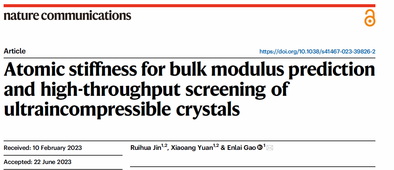 论文题为“用于预测体积模量的原子刚度理论与高通量筛选极不可压缩晶体” (Atomic stiffness for bulk modulus prediction and high-throughput screening of ultraincompressible crystals)。我校2021级本科生靳蕊华、2021级硕士生袁笑昂为共同第一作者,高恩来副教授为通讯作者,Bsports必一体育为唯一署名单位。