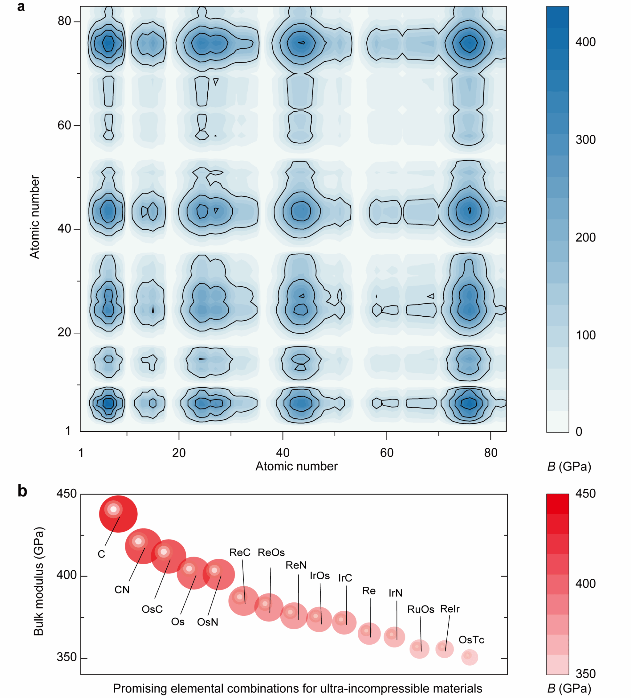 在该理论公式指引下,研究小组对现有数据库中百万种力学性能未知的晶体开展了体积模量高通量预测,从中筛选出超高模量晶体,并经第一原理计算验证,发现了47种刚度媲美金刚石的物质(体积模量 > 400 GPa)。作为对比,美国材料基因组计划数据平台Materials Project历时近十年使用第一原理计算只计算出一万多种晶体的弹性信息,其中刚度媲美金刚石的晶体不足十种(体积模量 > 400 GPa)。基于这个理论公式,研究小组绘制了超高模量物质的元素组合藏宝图 (图3),为未来逆向设计新型刚度媲美金刚石物质指明方向。