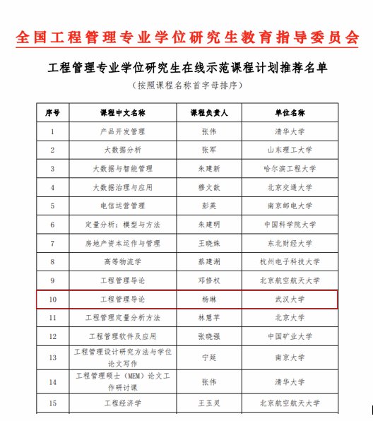 2023年全国工程管理专业学位研究生教育指导委员会发文,Bsports官网工程管理系杨琳副教授申报的《工程管理导论》获批全国工程管理专业学位研究生在线示范课程建设计划。