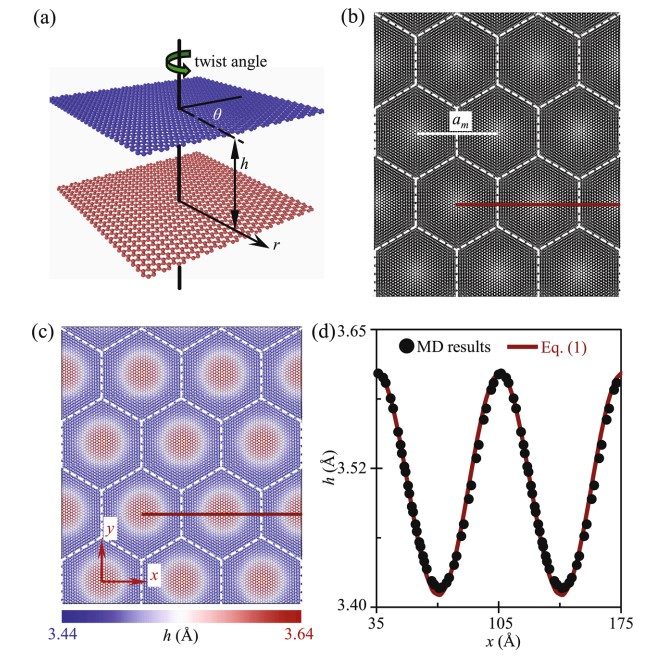 图1(a)双层扭转石墨烯,(b)云纹图案,(c)-(d)云纹依赖的面外变形