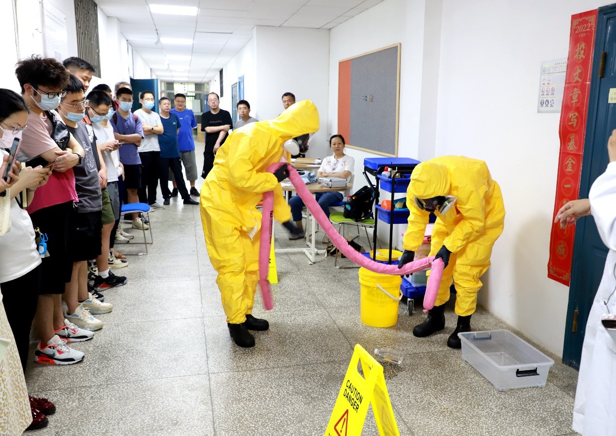 培训环节后,全体参会人员来到给排水实验室,在急救培训师翟永志的指导下,刘子正、李白红、石建等3位老师和杨海科、王斌等7位同学共同完成了一场完整、规范、严谨的危险化学品(浓盐酸)泄露紧急事件处置演练,详细解说了发生危化品泄露后如何紧急冲淋、向上报告、疏散通风、清理现场、事后分析总结等,观摩的师生认真观看,纷纷拍摄照片和视频。