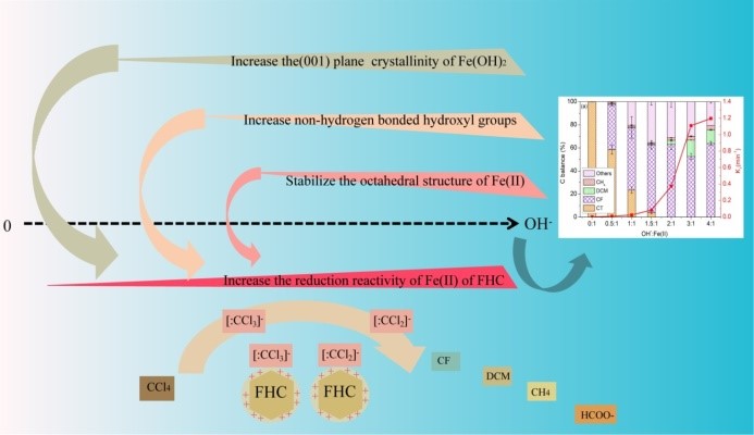 在此背景下,黄理志研究员课题组通过简便的合成方法获得了FHC,并借助XRD、红外、TEM、Zeta和穆斯堡尔谱学对其物相演变、亚铁微观八面体结构和还原活性有了全面认知。通过大量的实验详细阐述了不同因素下FHC的活性变化,间接证明羟基桥接作用,同时通过同位素替换直接证明羟基桥接亚铁到四氯化碳的电子转移过程。这项研究全面阐述了FHC的构效关系,为揭示不同环境条件下Fe(II)物种的反应性差异提供了理论指导。