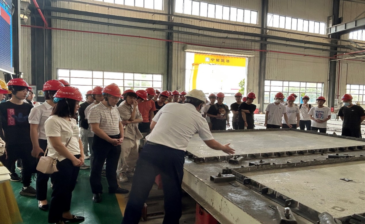 上午9点,学院师生乘大巴来到中建三局科创公司汉南厂,汉南厂厂长祁乐为老师和同学们讲解了智慧化预制构件的生产情况。