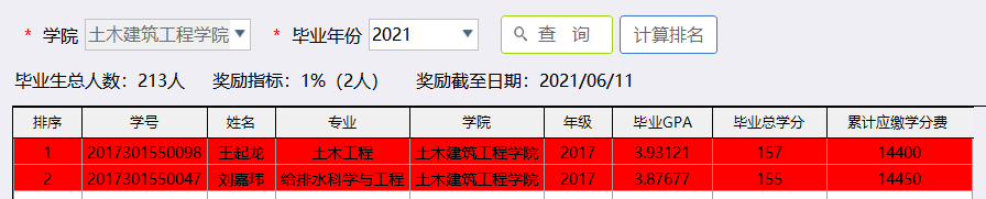 根据《Bsports必一体育全日制普通本科生学分制收费管理办法(试行)》(武大教字〔2011〕70号)中第五章第二十九条:学生毕业时总平均学分绩点排在当年毕业生总人数前1%的,返还全部课程学分学费。学院2021届本科毕业生总人数213人,Bsports官网总计2人获得1%优秀毕业生奖励,名单如下(本次学分绩点排名以2021年6月11日17:00时的毕业审核成绩为准):