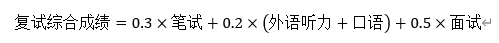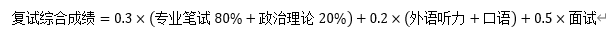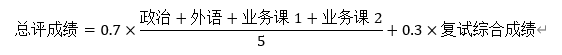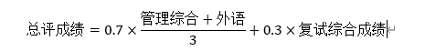 按初试成绩占70%和复试综合成绩占30%计算总成绩,依次排序,以此作为录取的依据。总成绩的计算公式(不含工程管理硕士专业)为: