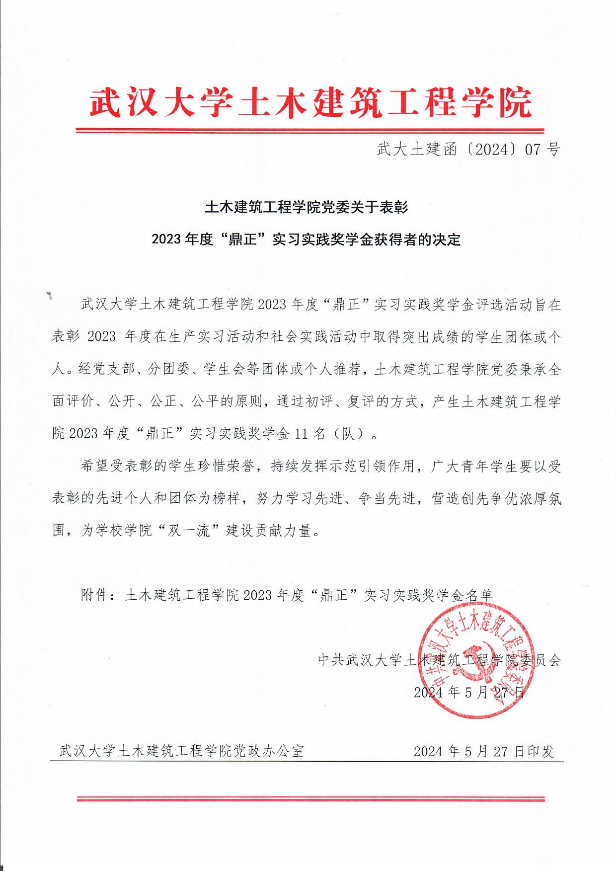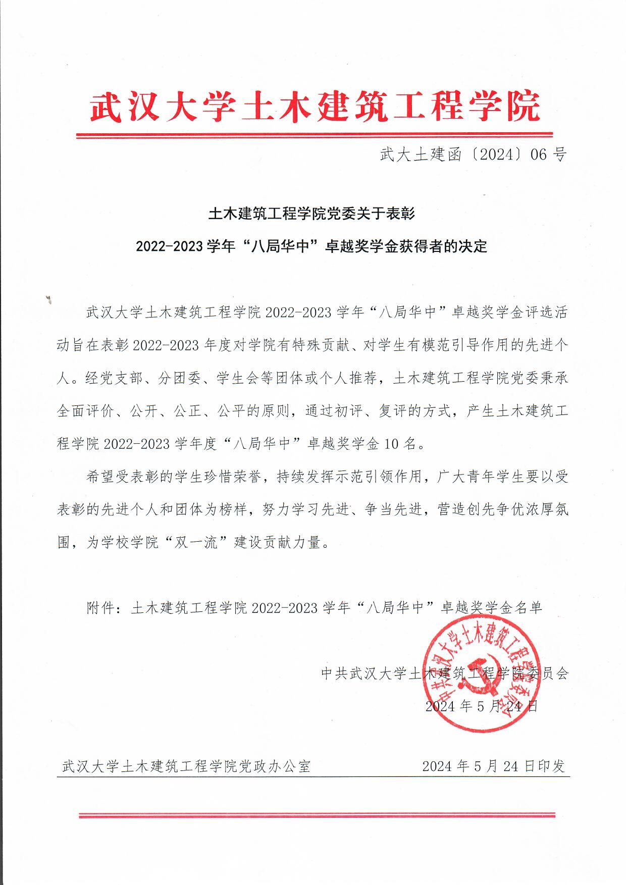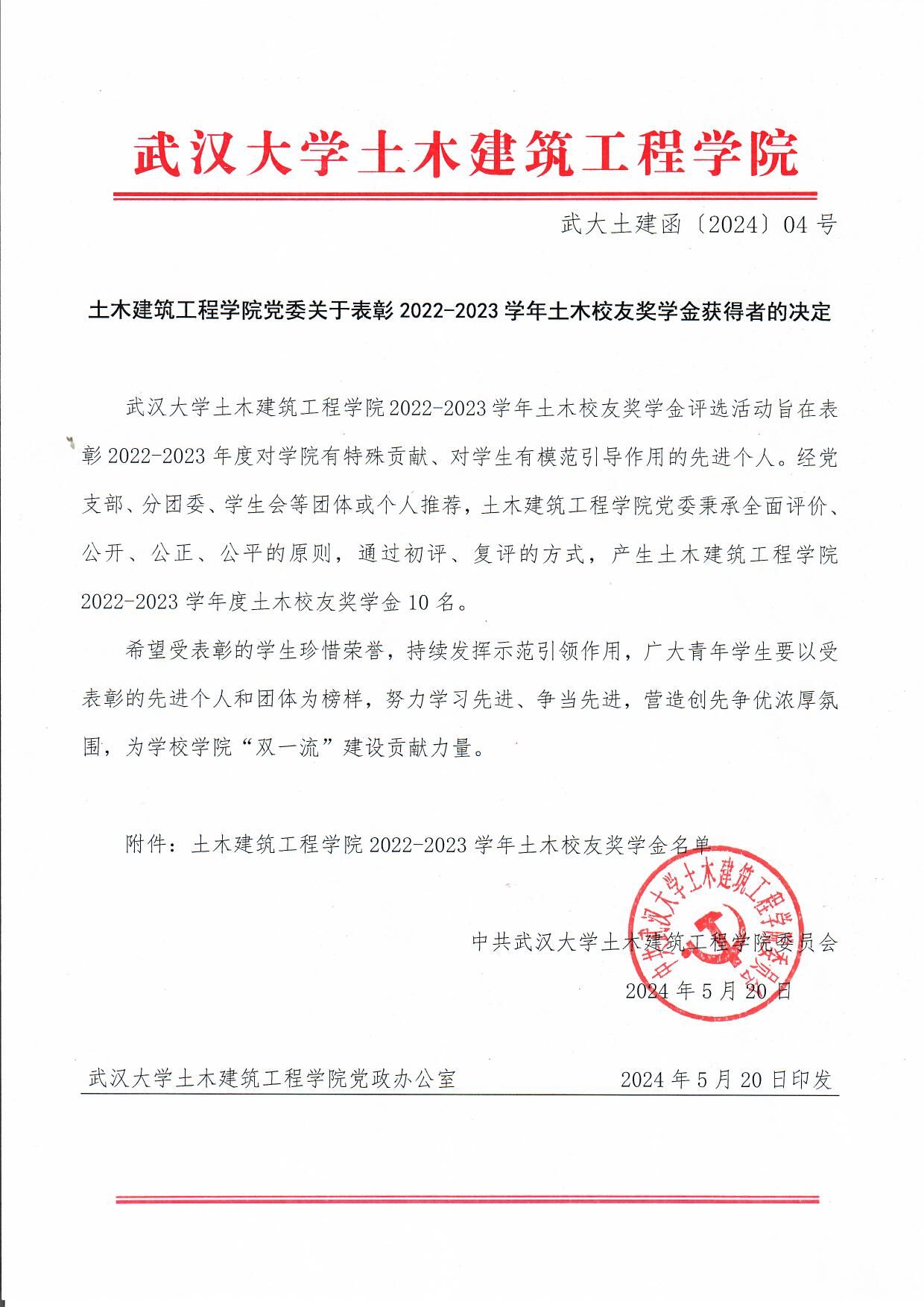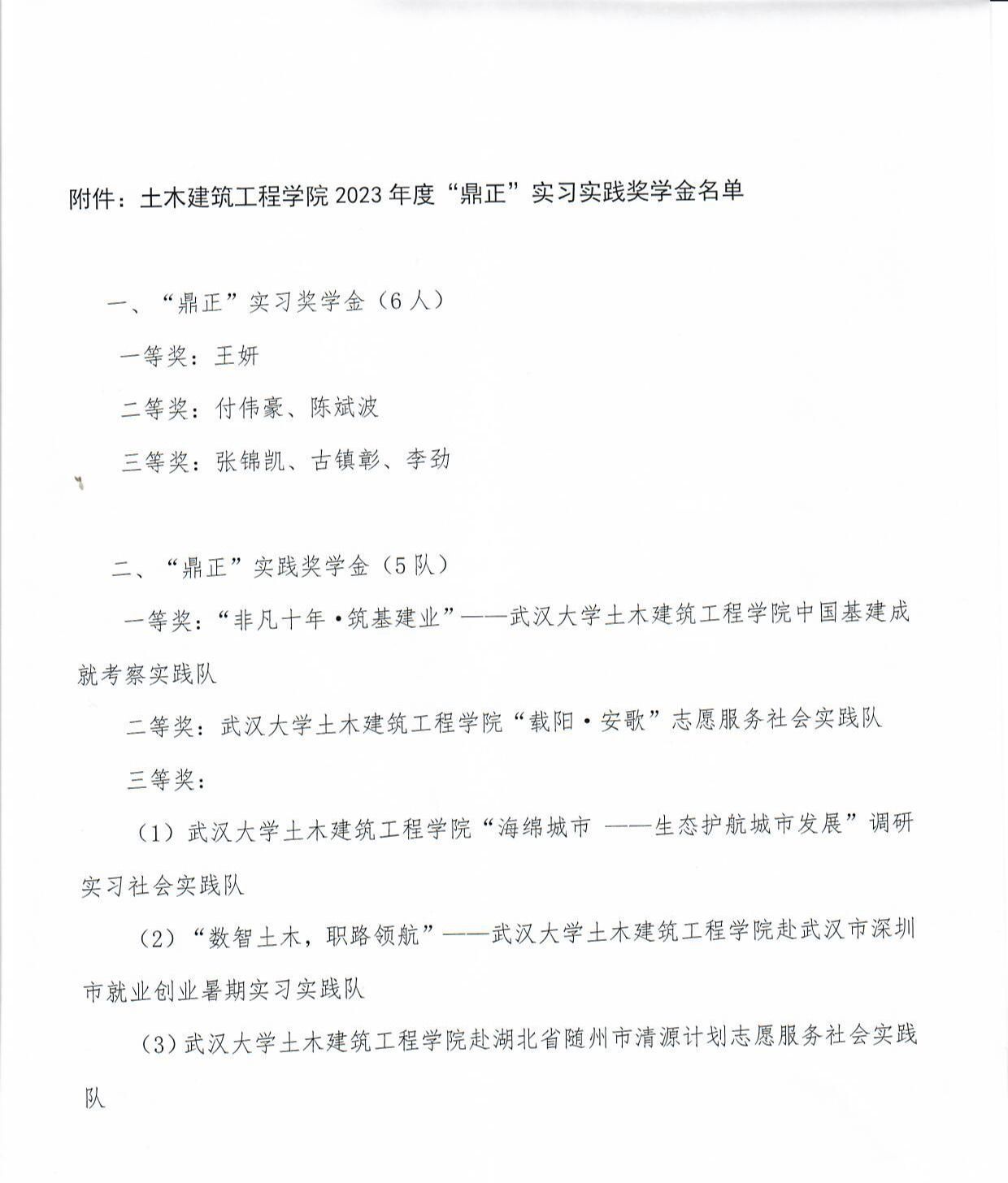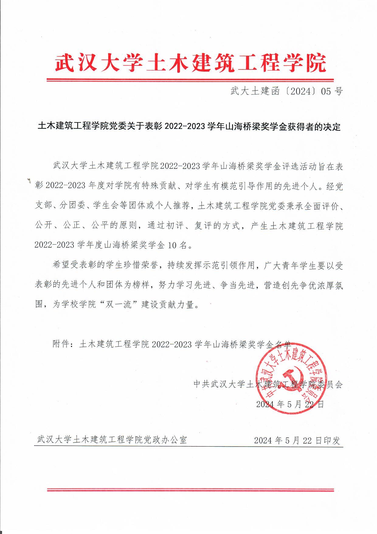 经团体或个人推荐,学院评审,并经过全院公示,现已确定了2022-2023学年度土木校友奖学金、山海桥梁奖学金、“八局华中”卓越奖学金、“鼎正”实习实践奖学金等四项院级专项奖学金获奖者名单,现将获奖名单公告如下。