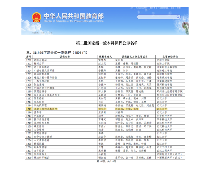 近日,教育部高等教育司对第二批国家级一流本科课程认定结果进行了公示,共认定5751门课程,其中,线上课程1095门,虚拟仿真实验教学课程472门,线上线下混合式课程1801门,线下课程2076门,社会实践课程307门。Bsports官网徐礼华教授课程团队建设的《混凝土结构基本原理》课程获批国家级一流本科课程(线上线下混合式)。