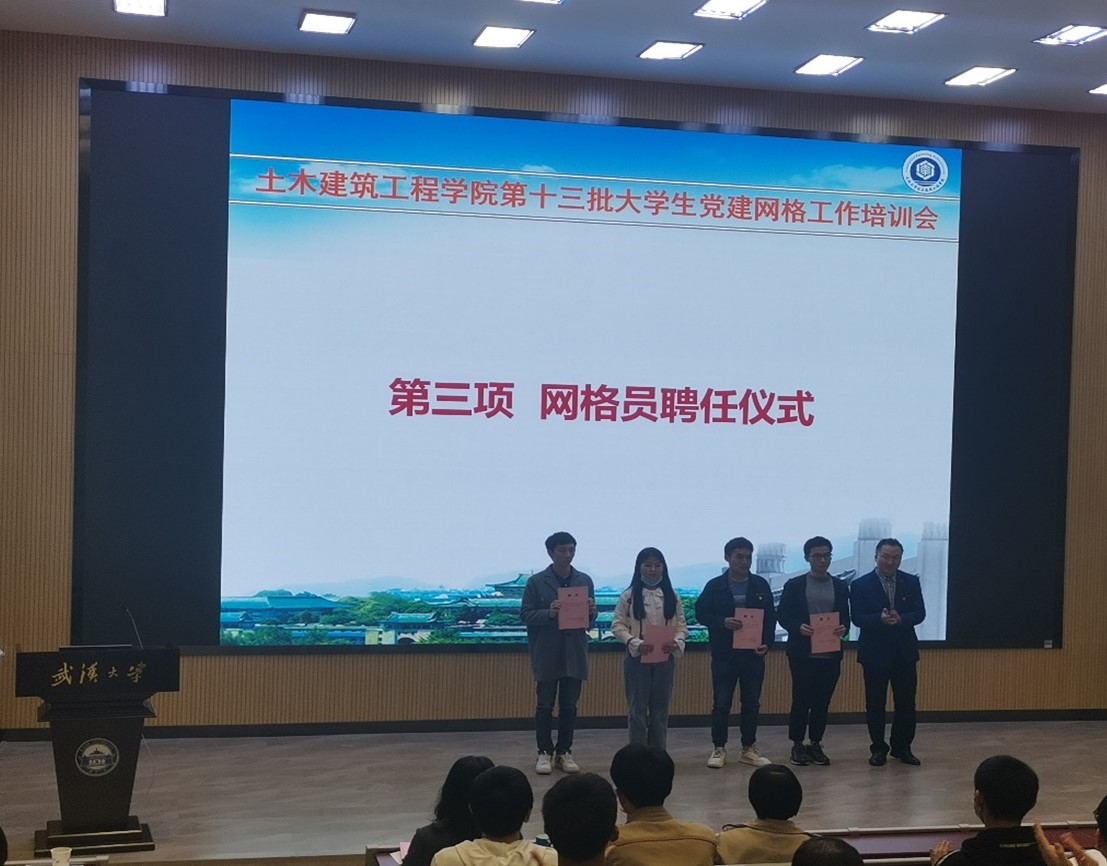 大会第三项,学生工作办公室主任余娟老师宣读学院第十三批大学生党建网格员聘任名单,谢献谋书记为党建网格员代表颁发聘书并合影。