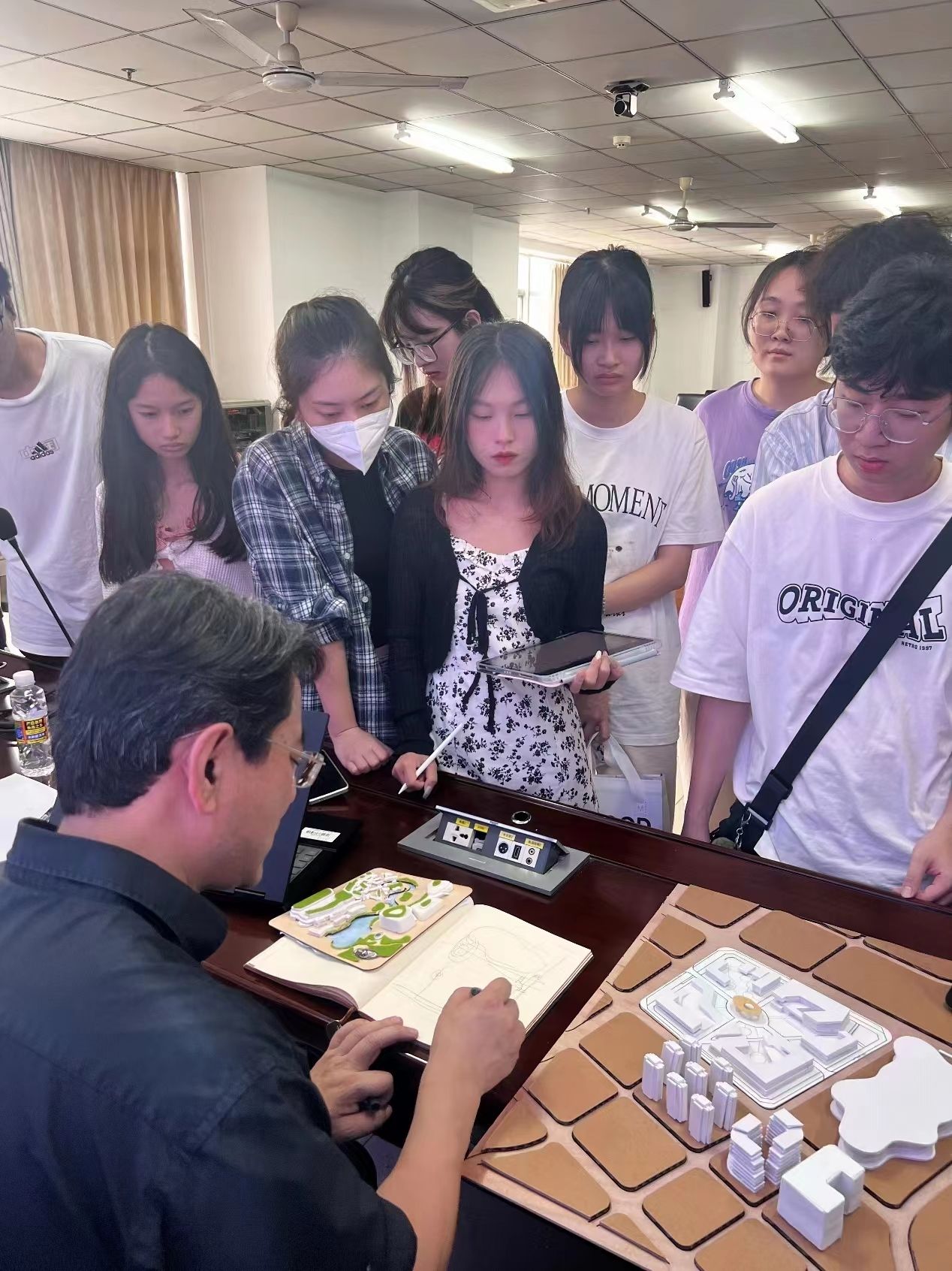 在针对四年级的课程,吴教授为第一次从事城市设计专题设计的建筑系同学们进行了设计指导。在课程设计指导的过程中,吴教授针对每组同学们的具体设计提供说明和修改建议,为同学们的城市设计布局推敲和项目深化进行了讲解。吴教授的授课内容丰富,互动性强,激发了建筑系的同学浓厚的学习兴趣。