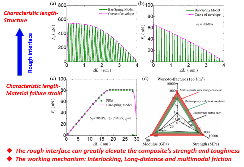 该研究建立了描述单个凸起对攀爬行为的微观力学理论模型,推导得出了等效内聚力模型,进一步结合杆-弹簧模型实现了界面多凸起依次攀爬、滑动全过程的计算分析。结果显示:和仅包含生物聚合物的平整界面相比,存在矿物凸起的粗糙界面可提高复合材料的强度和韧性2-3个数量级,表明矿物凸起这种次级微结构对珍珠母的增强增韧作用十分重要,不可忽略;其增强增韧的机理,在于(1)凸起间“攀爬”的机械互锁行为提高了界面的强度,(2)多凸起间反复“攀爬-滑移”造成的长程、多峰的类摩擦行为。值得一提的是,通过对椭圆、双曲余弦、余弦和抛物线等不同凸起形状的对比分析,发现这种微结构粗糙界面的增强增韧效果对凸起的形状不敏感,从材料微结构设计角度而言具有很好的鲁棒性。