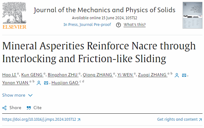 近日,固体力学旗舰期刊JMPS(Journal of the Mechanics and Physics of Solids)在线发表了Bsports必一体育工程力学系张作启教授、原亚南副教授课题组关于矿物凸起对珍珠母贝壳增强增韧效果和机理的研究论文,论文题目为“Mineral Asperities Reinforce Nacre through Interlocking and Friction-like Sliding” (https://authors.elsevier.com/a/1jHr057Zk98Jz)。