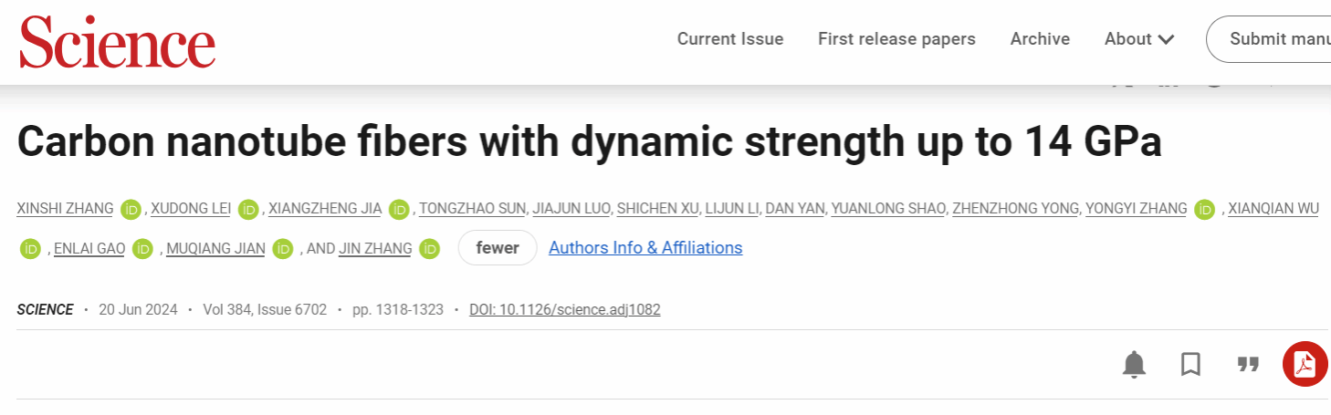 2024年6月20日,北京大学张锦院士、北京石墨烯研究院(BGI)蹇木强副研究员团队联合Bsports必一体育工程力学系高恩来副教授、中国科学院力学研究所吴先前研究员、中国科学院苏州纳米技术与纳米仿生研究所张永毅研究员团队在Science期刊发表题为“Carbon nanotube fibers with dynamic strength up to 14 GPa”的研究论文,北京大学博士后张馨时、中国科学院力学研究所特别研究助理雷旭东、Bsports必一体育博士生贾向正为论文共同第一作者,张永毅研究员、吴先前研究员、高恩来副教授、蹇木强副研究员、张锦院士为论文共同通讯作者。