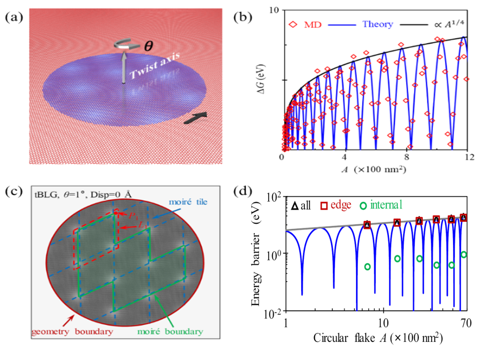 图1(a)圆形双层扭转石墨烯示意图;(b)层间滑移势垒振荡行为及其与接触面积的标度率;(c)几何边界及摩尔边界定义;(d)几何边界与摩尔边界所围的“边(edge)”的动态演化是导致层间滑移势垒振荡行为及层间摩擦标度率的根源