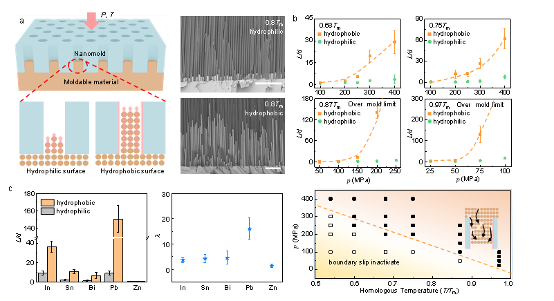 该工作基于刘泽教授课题组此前发明的纳米模塑技术(Nature Communications, 8, 14910, 2017),通过对比不同温度和压力条件下,金属在具有不同表面润湿性的纳米通道中的蠕变流速(图1a),发现只有当金属处于扩散主导的变形温度区间,且边界滑移处于激活态时,低粘附纳米通道中金属蠕变流速才会发生数量级的提升(图1b);进一步研究表明尽管受金属晶体结构的调制,但上述结论在所考察的金属中具有普适性(图1c)。