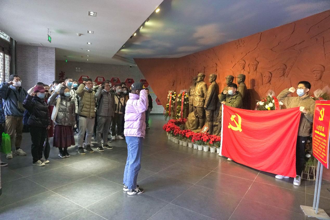 跟随讲解员的步伐和解说,党员同志们走进新四军第五师历史陈列馆,耸立在眼前的大型浮雕群英图,气势非凡。在英雄群像前,党员同志们自觉汇集起来,面向党旗郑重宣誓,重温入党誓词,共同追寻入党的初心和使命。