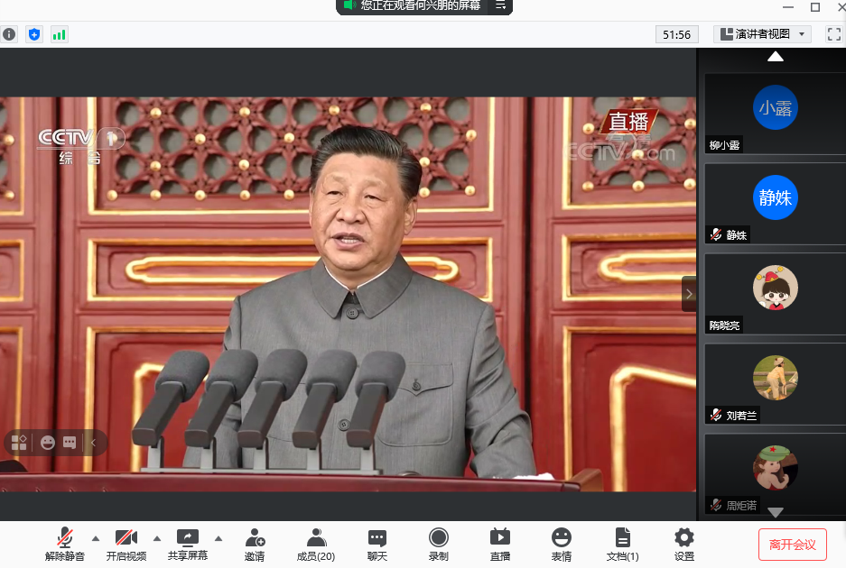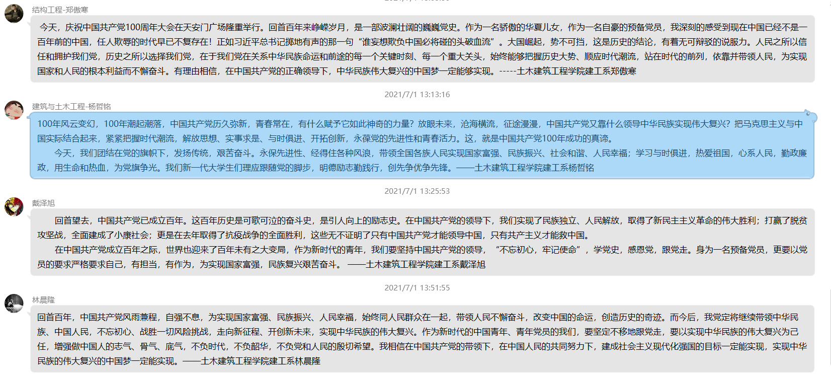建筑工程系研究生第二党支部采用线下自学、线上交流相结合的形式,通过新华社微信公众平台同步学习习近平总书记在庆祝中国共产党成立100周年大会上重要讲话,并在支部 QQ 群中充分交流学习体会。支部书记陈淼表示,今天是建党一百周年,中国共产党历经数年血雨腥风,才有如今幸福美好的中华人民共和国。浙江嘉兴游船上,只有数十名的中国共产党人成立了这一无产阶级革命政党, 从此带领中国人民开天辟地,建设人民当家作主的中国。前辈们饱受摧残,仍然坚定信念,因为他们相信中国的未来是光明的,正是因为他们的坚定,我们相信振兴中华是可以实现的。我们必将牢记先辈的付出,为社会主义事业奉献终身。