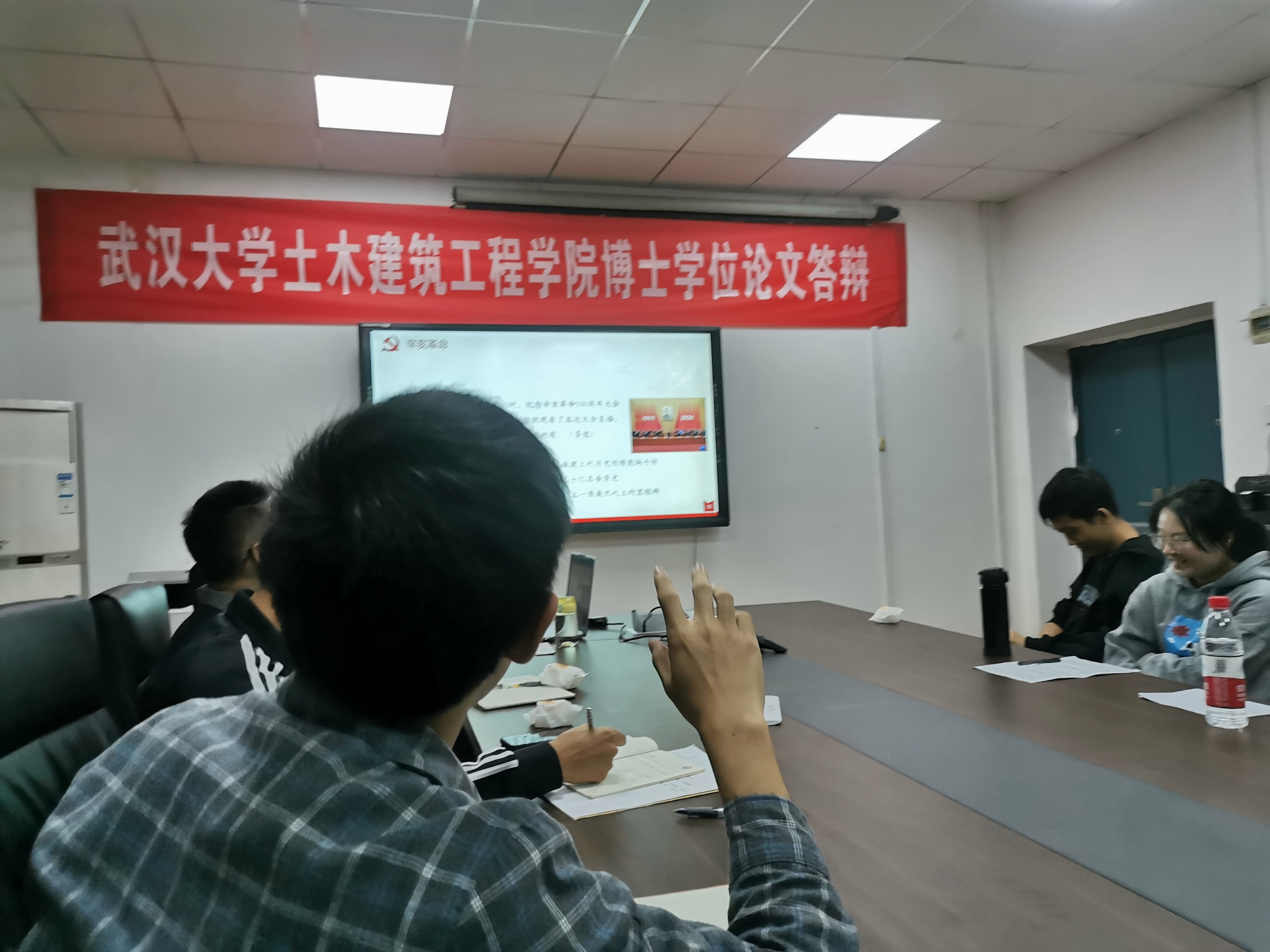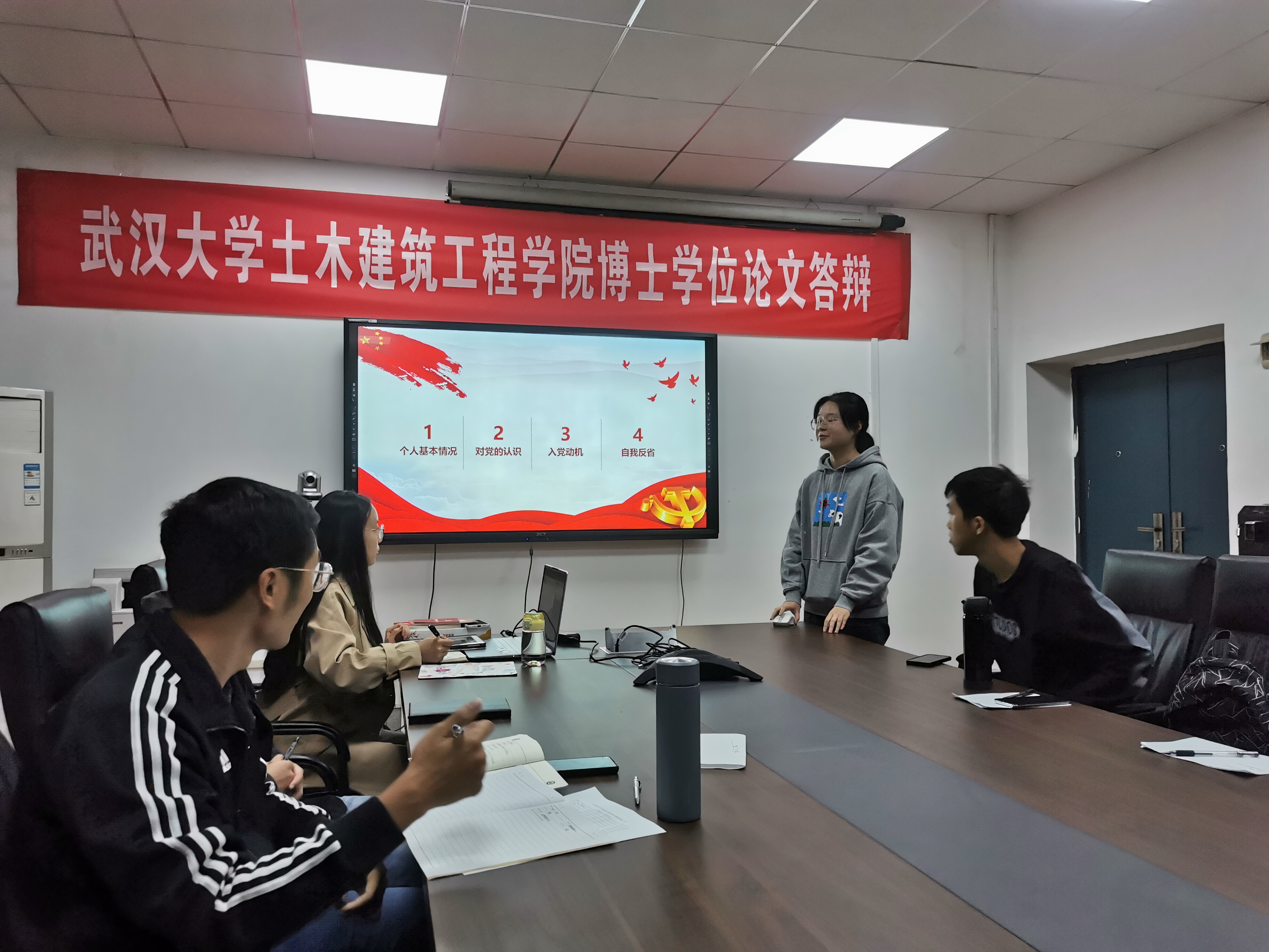 首先召开的是支部党员大会。会上三位发展对象胡子欣、李璟冉、王俊同志依次进行了入党答辩,他们以PPT展示的形式,分别从个人基本情况、对党的认识、入党动机和自我评价与反省四个方面进行了汇报。展示结束后,支部党员就党的理论知识及个人情况对发展对象进行了提问考察。三位发展对象答辩结束后,支部党员经过讨论和决议,一致通过了三位同志的入党答辩。