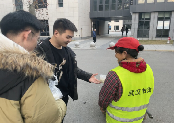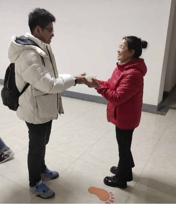 饺子煮熟后,支部党员同志将打包好的饺子送予在寒冬中仍在辛苦工作的环卫工人、保安以及门卫们,是他们在平凡的工作岗位上默默无闻、任劳任怨,用辛勤的汗水为我们创造了一个干净整洁、和谐舒适的校园,让我们可以在一个良好的环境里专心学习科研、共同成长进步。故此,我们以这种形式为他们送上祝福,希望大家亲手制作的暖冬饺子可以驱散冬日的严寒,送上一份暖暖的情谊。