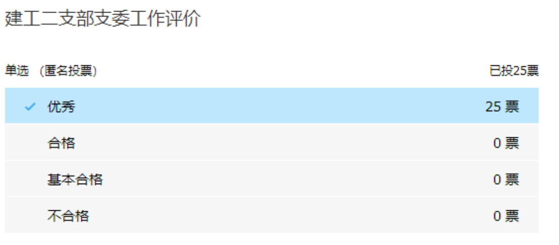 与会党员经过充分热烈的批评与自我批评之后,进行民主评测。首先对党支部委员会近一年的工作,按照“优秀”、“合格”、“基本合格”、“不合格”等四个等次评议,与会成员对于支委会三位成员高度认可,全票优秀。之后对党员按照“优秀”、“合格”、“基本合格”、“不合格”进行民主测评,其中马文涛等9名党员获评优秀,石尚杰等19名党员获评合格,无基本合格与不合格党员。